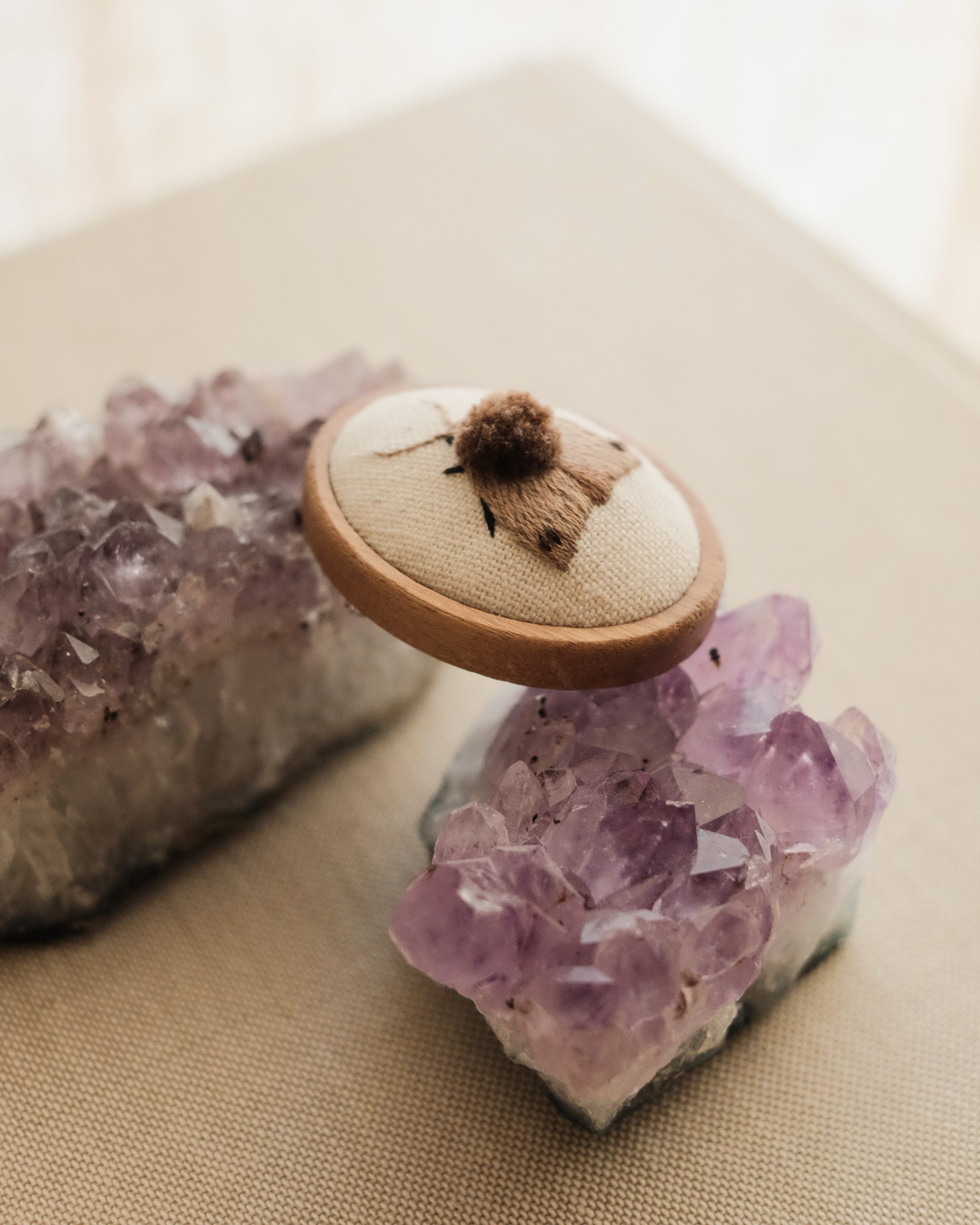 Il s'agit d'une petite broche (ou d'un mini cadre, au choix), brodée à la main.