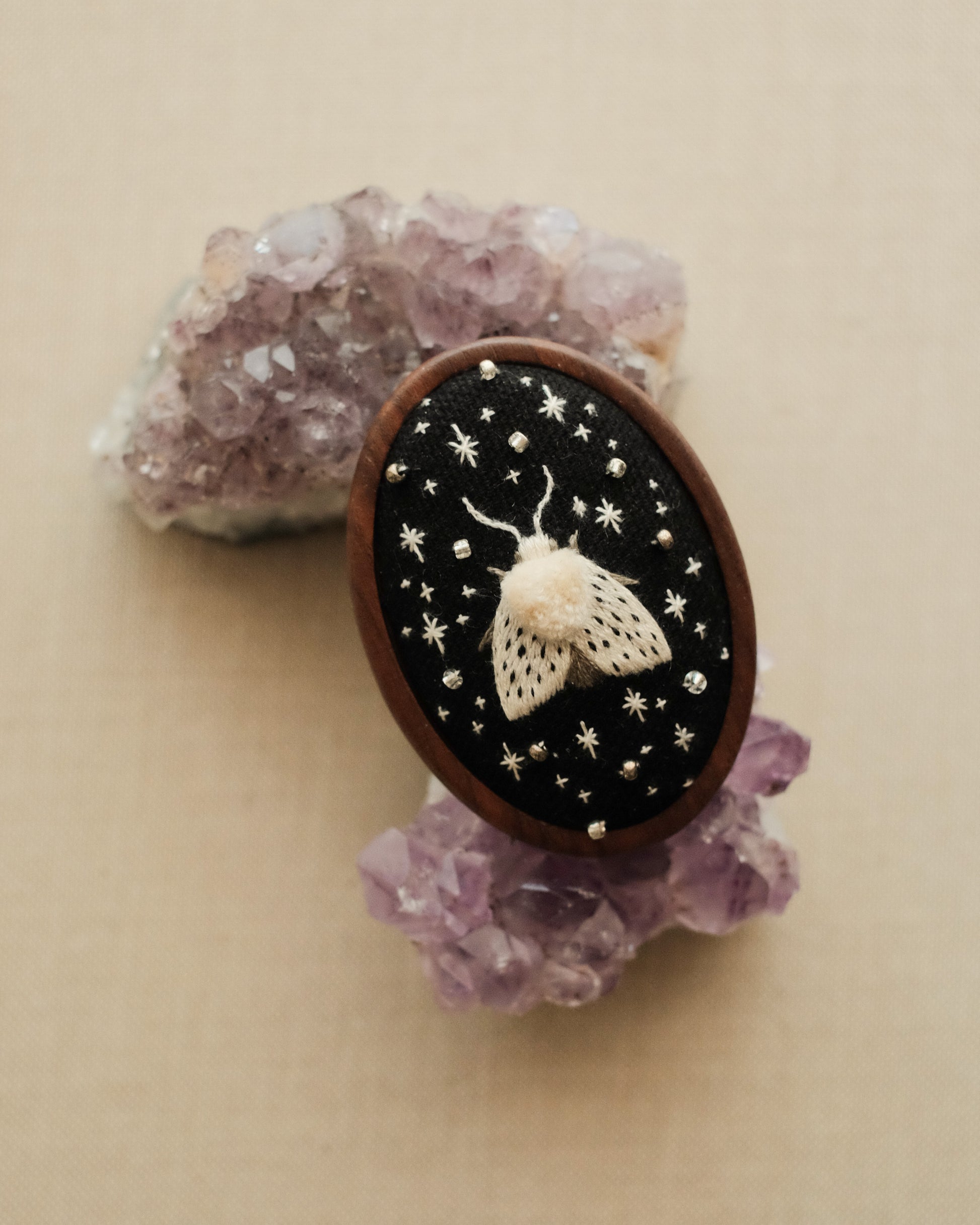 Aussi, je réalise souvent plusieurs exemplaires d'un même modèle, je ne refais pas les photos pour chaque produit. Il y aura donc forcément de petites variations, c'est ce qui fait le charme de la broderie à la main. Aucune création n'est exactement la même qu'une autre !